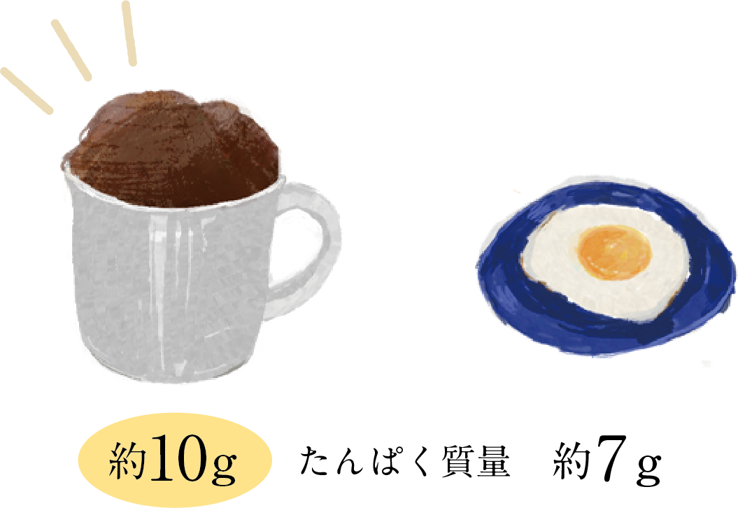 豆乳や牛乳など、調理の際に入れるミルクに含まれるたんぱく質を合わせて、1食につき約10gのたんぱく質※1をとることができます。自分の体重×0.73g※2が一日の健康維持に必要な最低限のたんぱく質量と言われているので、不足分を補う食事としてご活用ください。